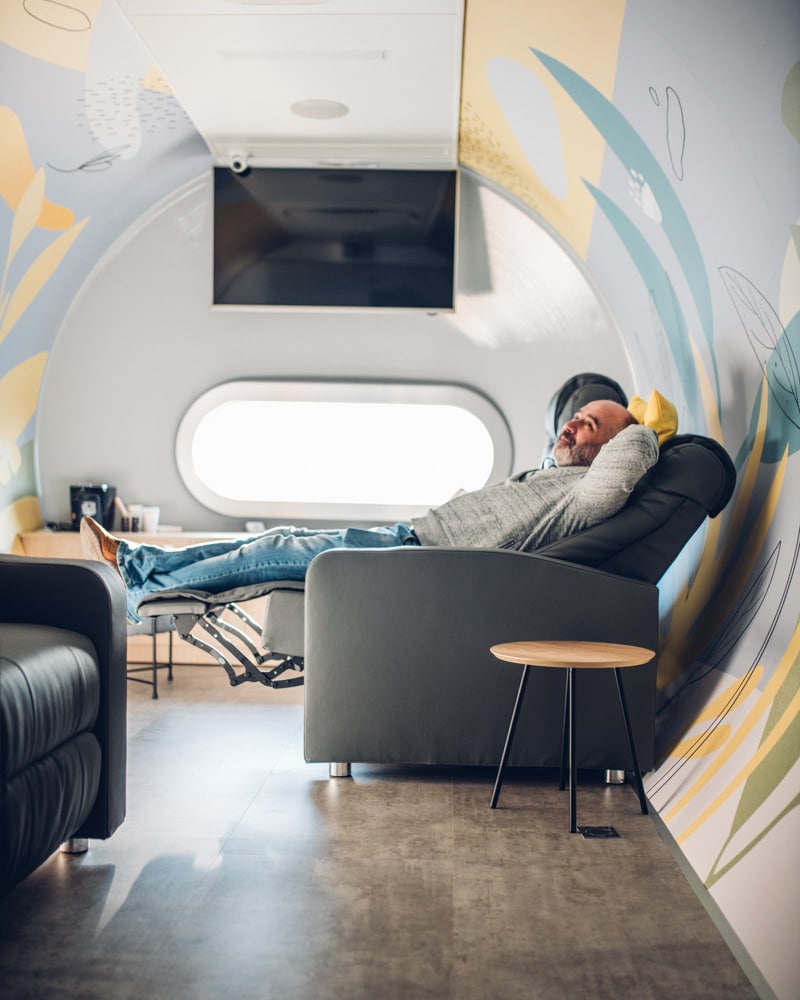 Sesja, w trakcie której poczujesz się wyjątkowo. Pomieszczenie z wygodnymi fotelami lounge, rozkładanymi do pozycji leżącej zapewnia maksimum komfortu i prywatności. Do Państwa dyspozycji ponad to zostawiamy telewizor, możliwość podłączenia się bezprzewodowo do wifi i źródeł dźwięku. Nielimitowane są także napoje ciepłe – kawa oraz herbata. Pomieszczenie idealnie nadaje się dla małych grup (do 4 osób, które cenią sobie spokój i komfort.